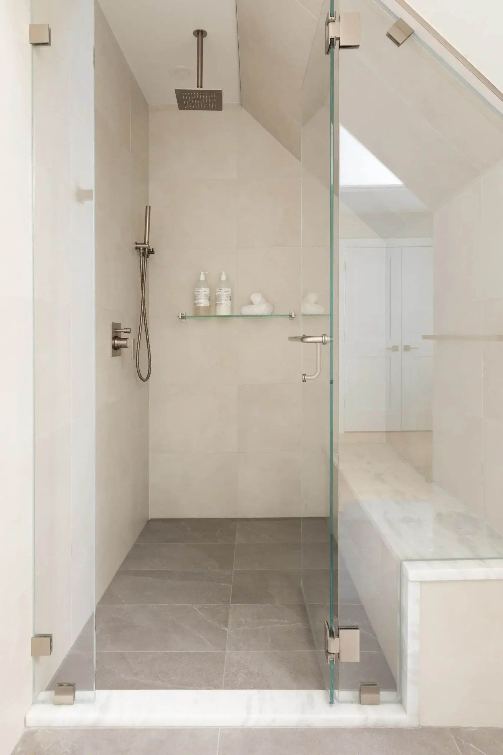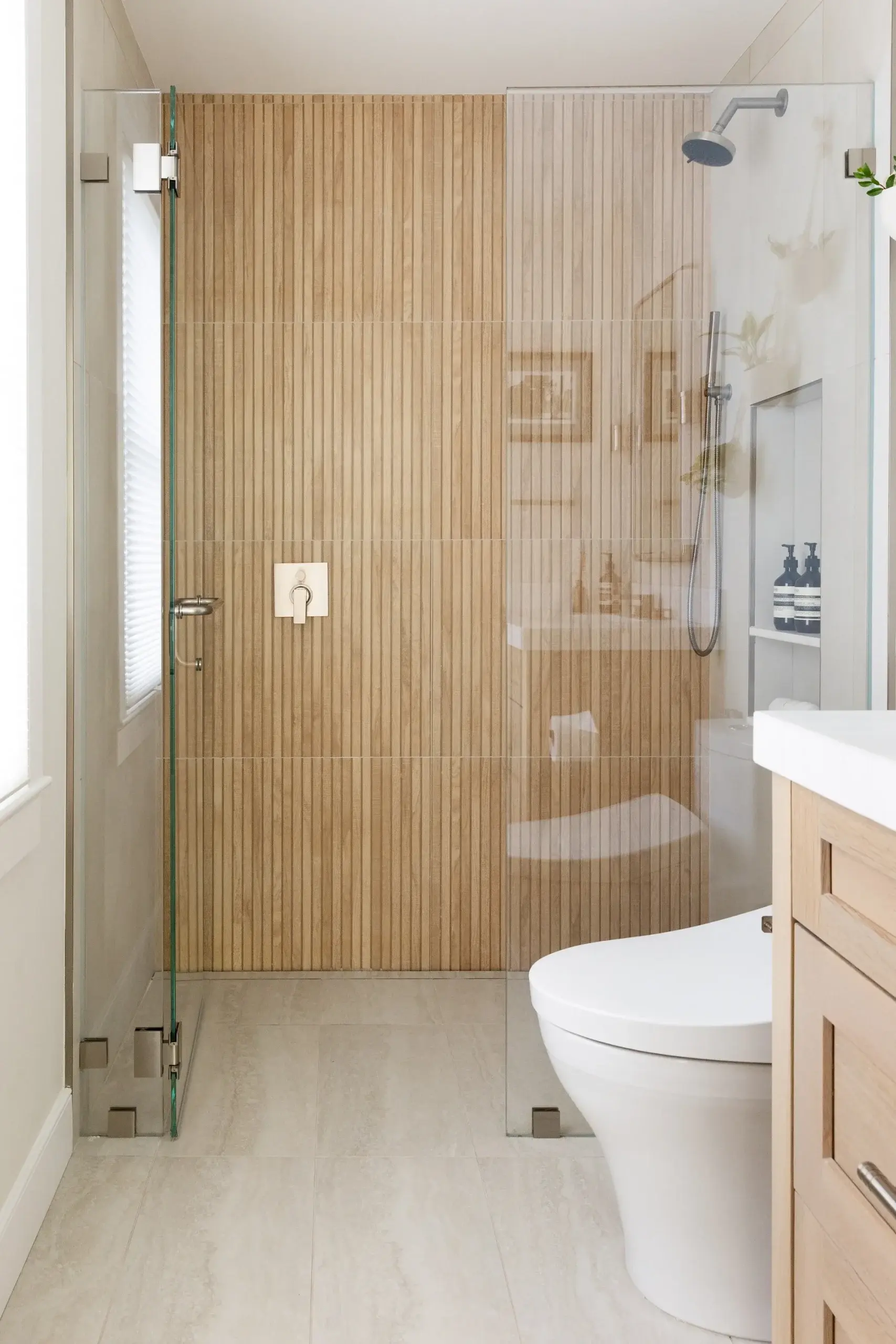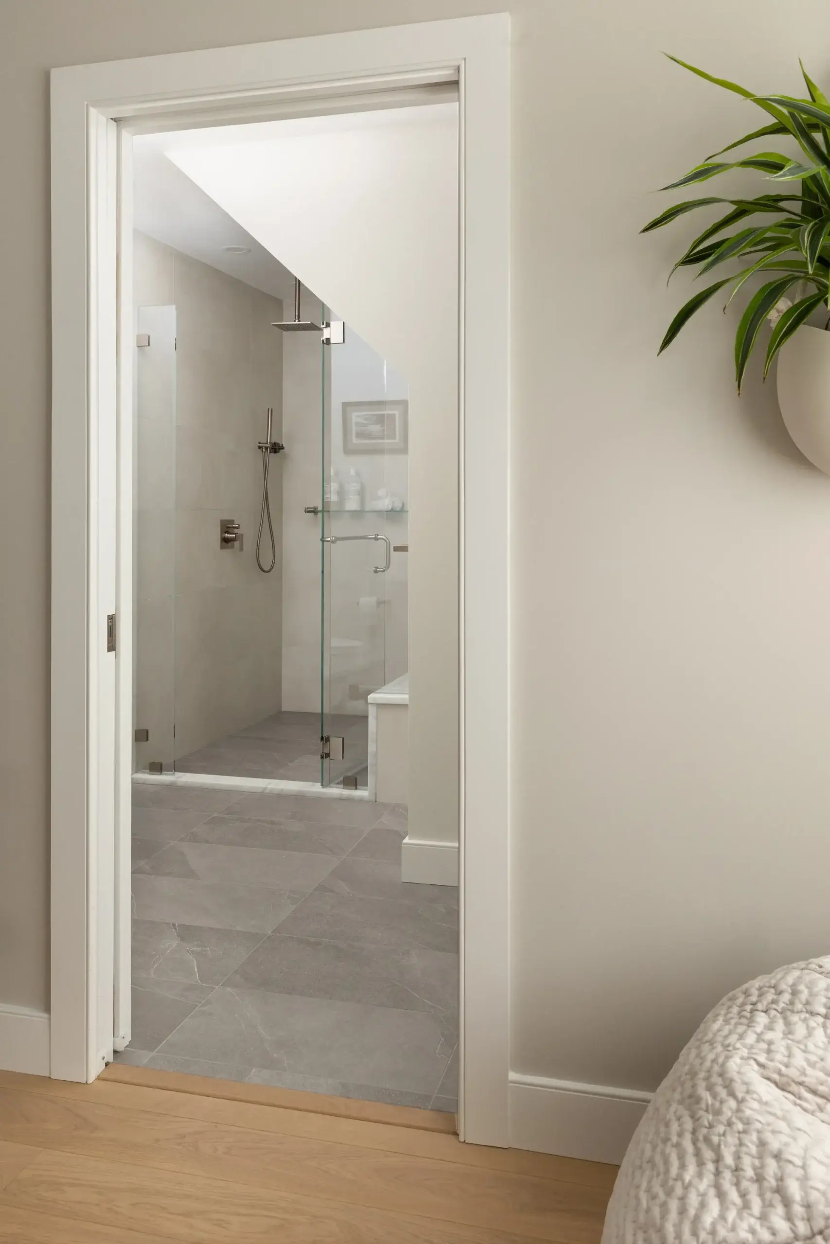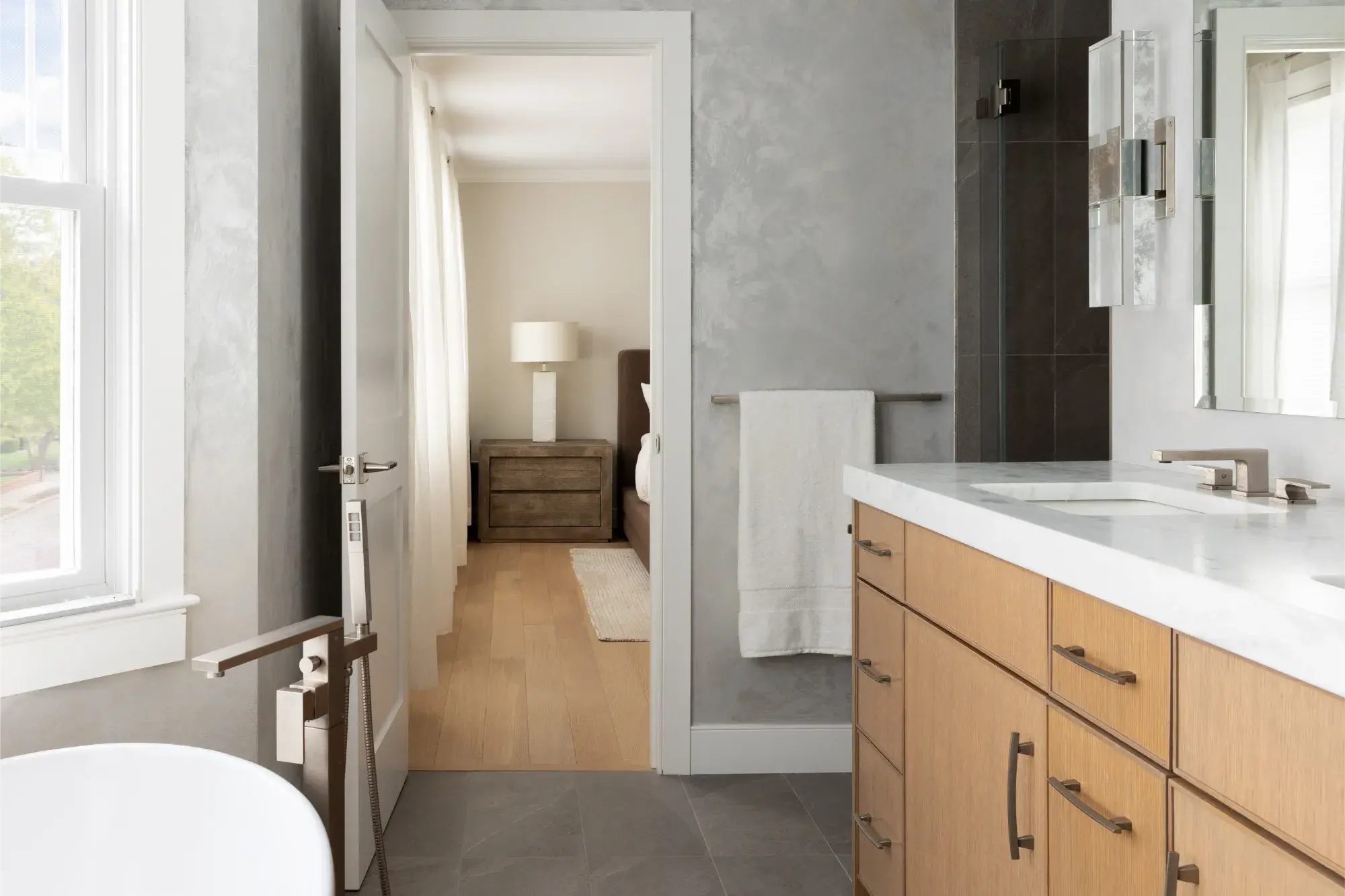 The biggest transformation in the home was reimagining the configuration of bathrooms and walk in closet on the second floor. Previously, the closet sat at the front of the home, flooded with natural light from a bay window, while the windowless bathroom felt dark and disconnected. By switching the position of these two rooms, our clients can take advantage of great lighting when they start and end their days. Updates were made to an additional second floor bathroom, removing the existing tub and replacing with a curb-less shower and linear drain. The large format tiles are meant to look like wood, feeling tonal and textural in this peaceful space.