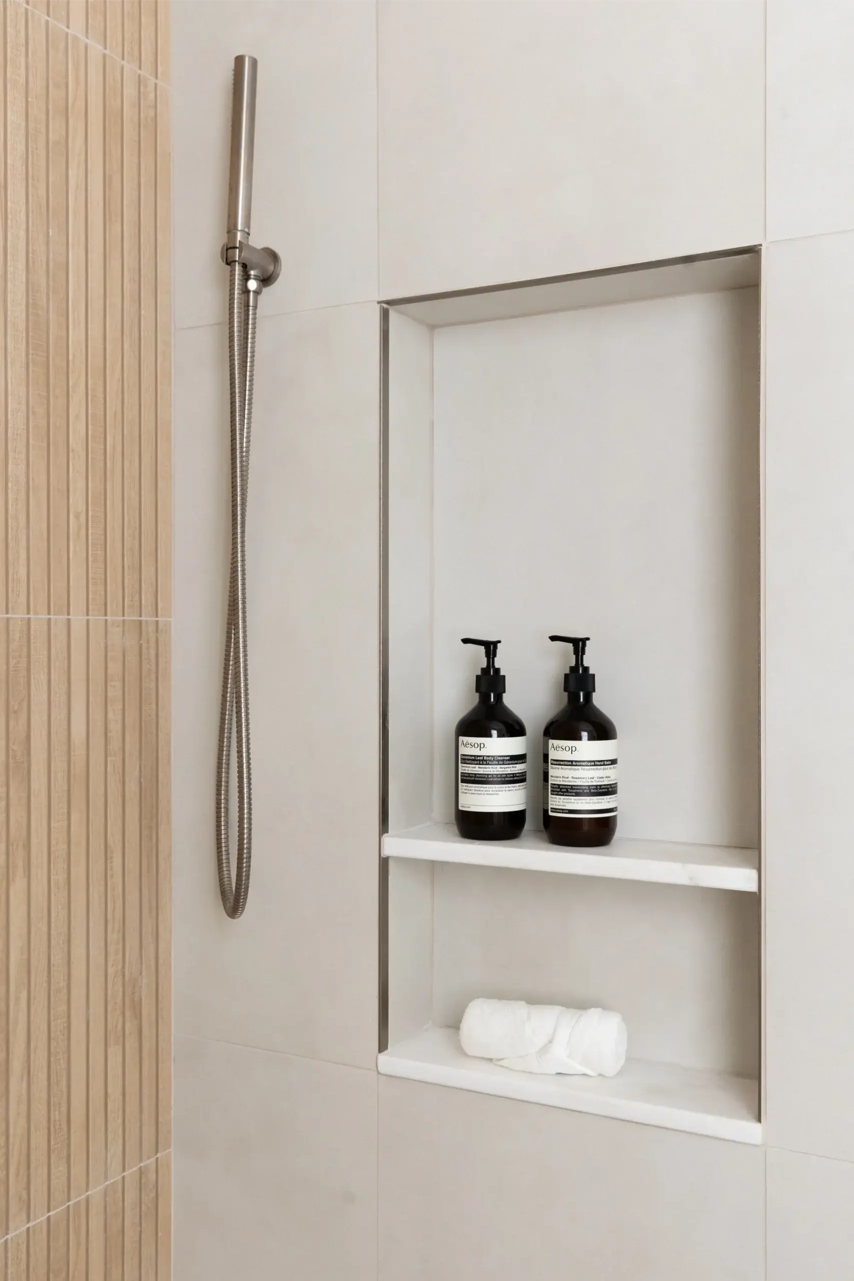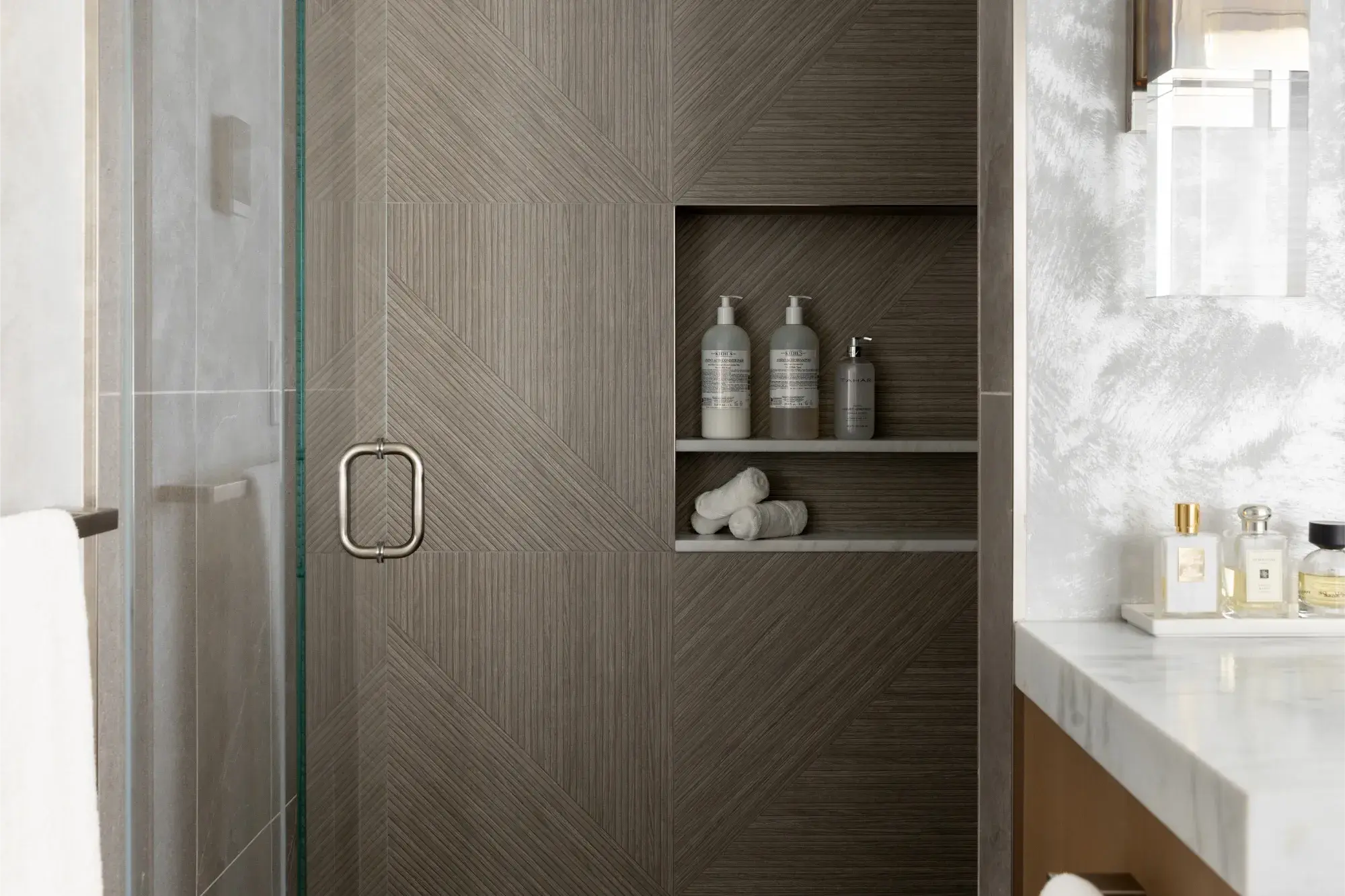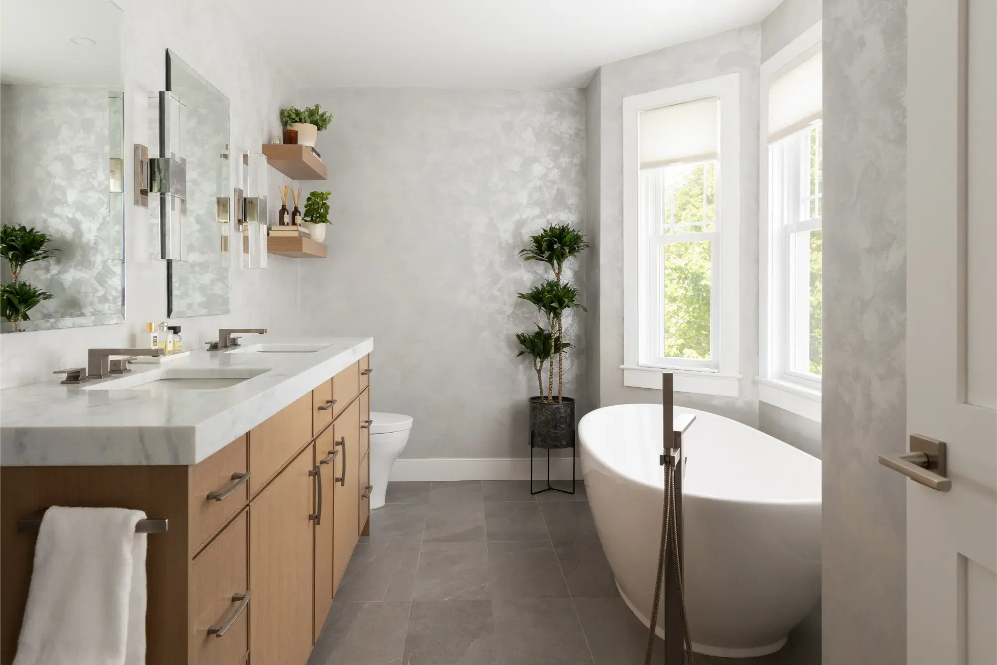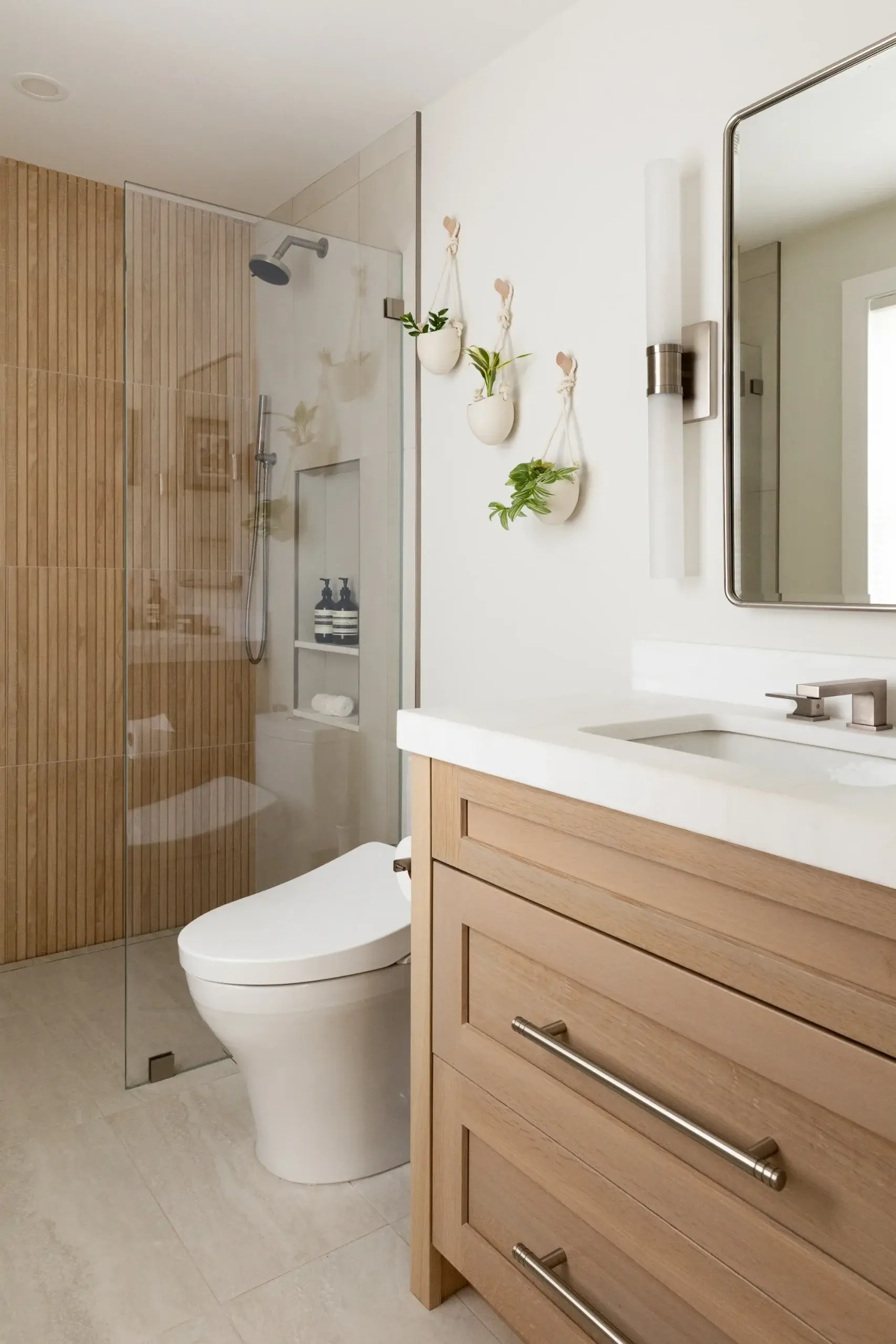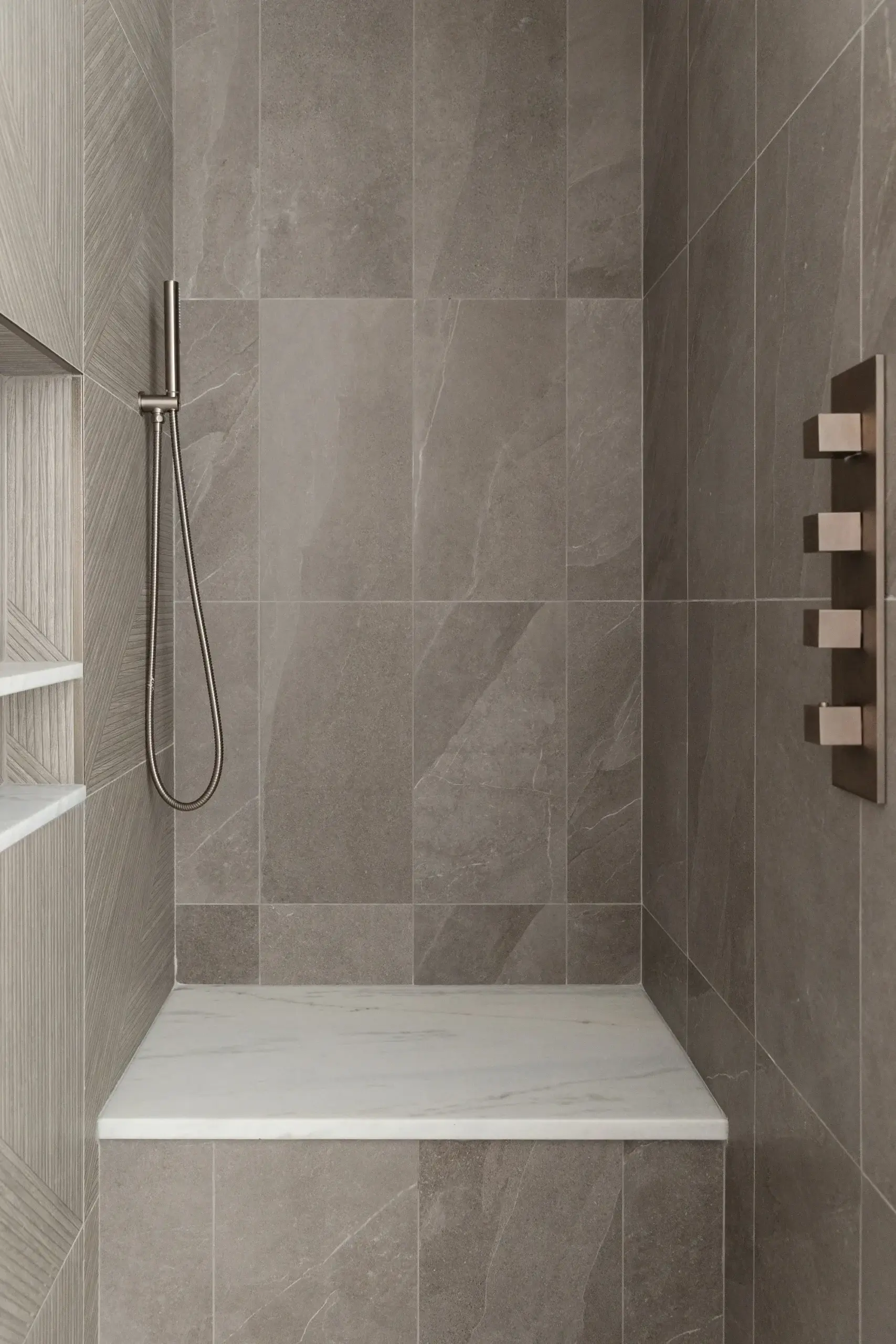 The biggest transformation in the home was reimagining the configuration of bathrooms and walk in closet on the second floor. Previously, the closet sat at the front of the home, flooded with natural light from a bay window, while the windowless bathroom felt dark and disconnected. By switching the position of these two rooms, our clients can take advantage of great lighting when they start and end their days. Updates were made to an additional second floor bathroom, removing the existing tub and replacing with a curb-less shower and linear drain. The large format tiles are meant to look like wood, feeling tonal and textural in this peaceful space.