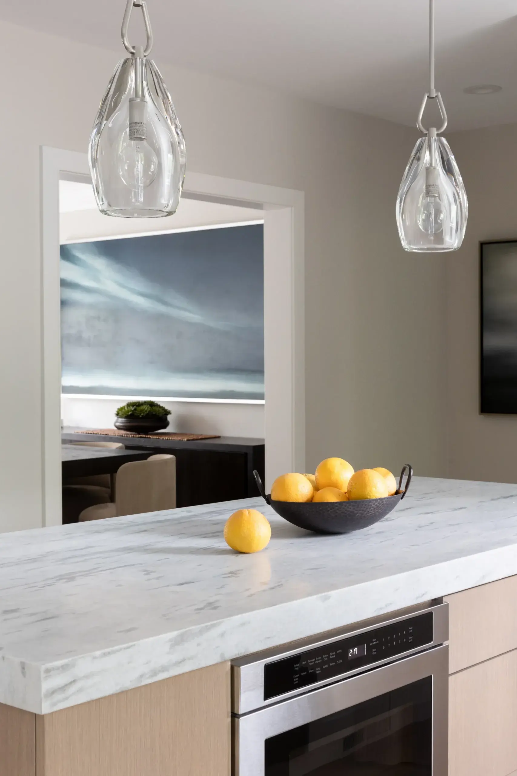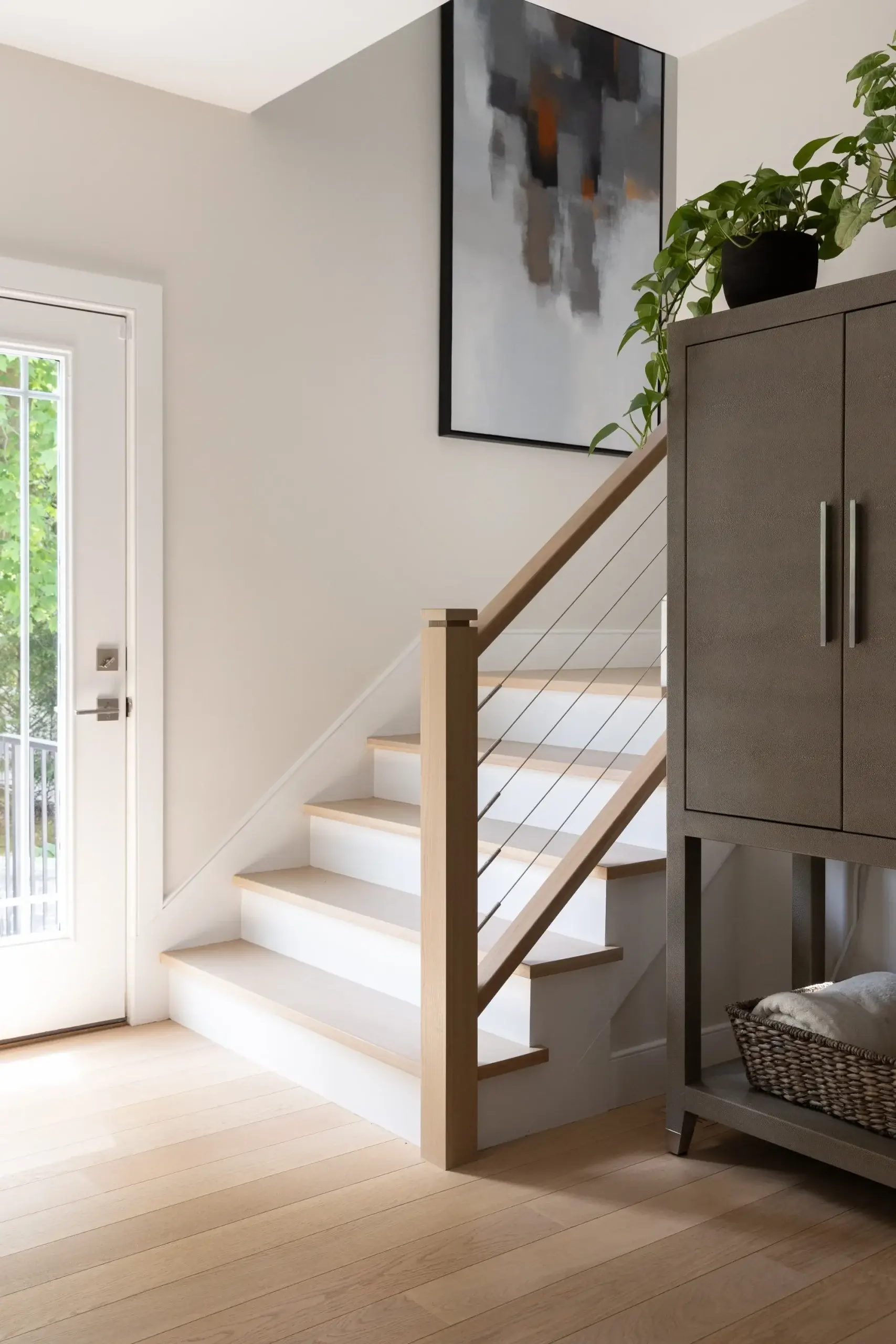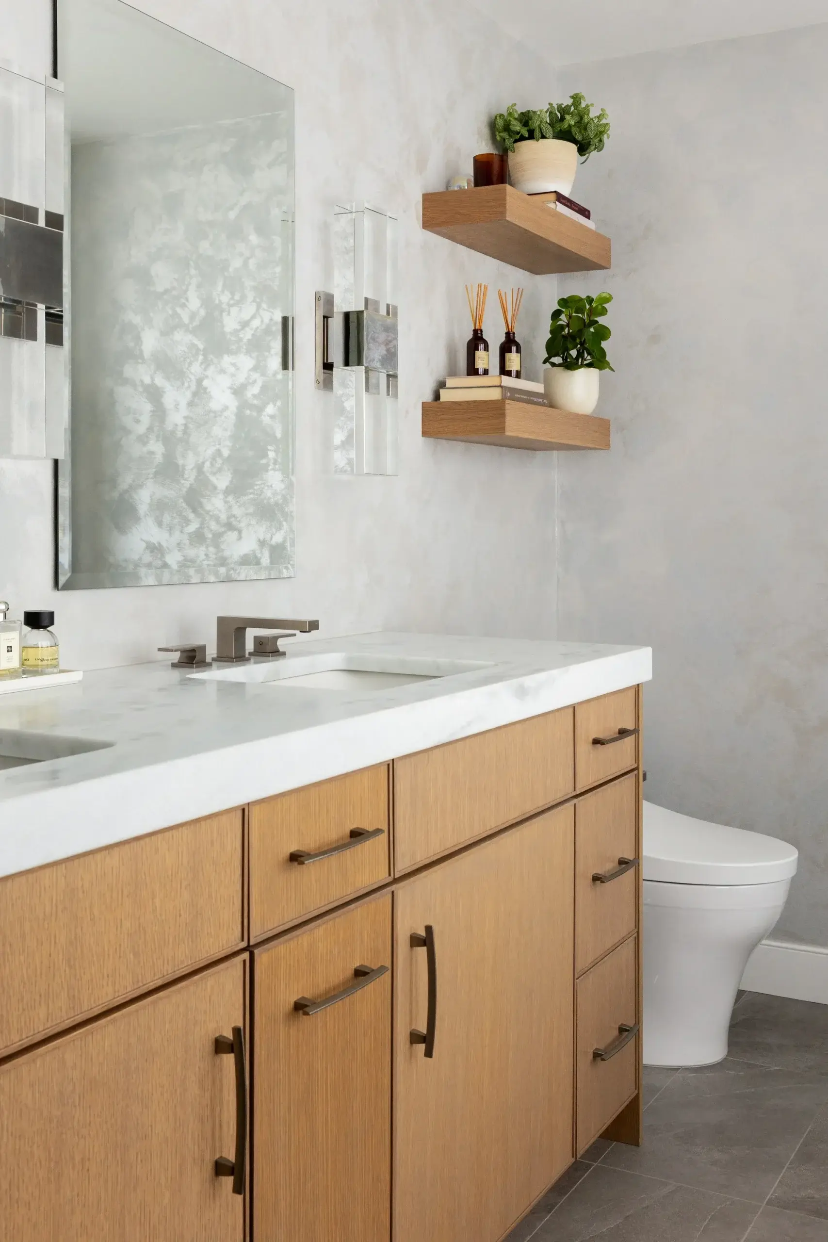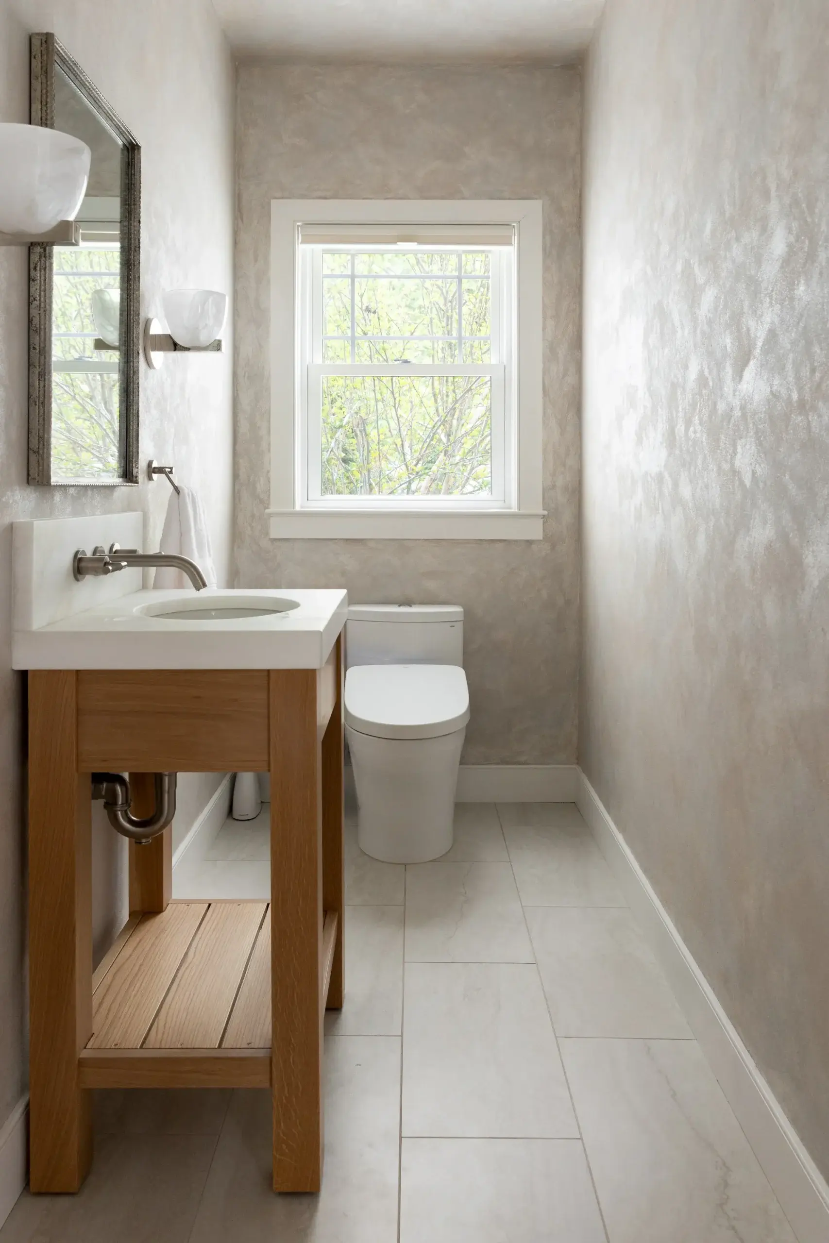 On the first floor, we began by removing an unused corner fireplace to open the space. We updated the kitchen to be more in line with the client’s tastes, opting for white cabinets offset by a white oak kitchen island and a modern subway backsplash. The first-floor bathroom features a beautiful venetian plaster on the walls that is used throughout the home in different tones. This was done by a local artisan and added a unique texture that wallpaper could not replicate. We replaced the existing vanity with a custom white oak console vanity to give the narrow bathroom the illusion of more space.